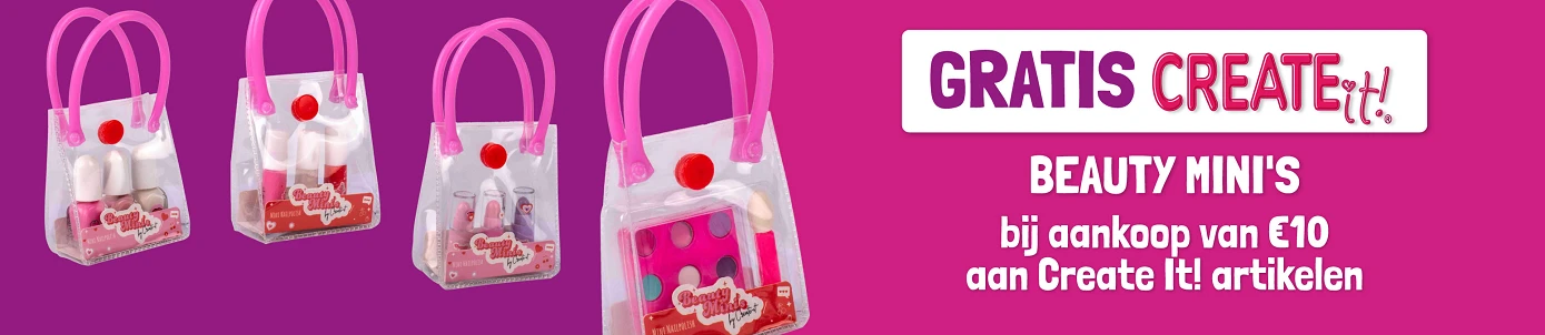 Create it! make-up is gemaakt voor jonge meiden met karakter. Met knal kleuren van rood, roze en paars tot aan zachte Create it! pastelkleuren creƫer je iedere keer weer een andere unieke look. De lijn met echte make-upproducten voor kinderen varieert van nagellak en lippenbalsem tot tattoopennen en nog veel meer. Kies jouw favoriete make-up van Create it!