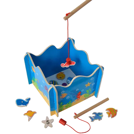 Werp je hengel uit en vang alles wat er rondzwemt in deze mooie houten visspellen! De kleurrijke vissen van een houten visspel zorgen voor uren speelplezier bij kleine vissers. Het spel stimuleert het observatievermogen en de oog-hand coördinatie. Dankzij het magneetje op de vis kun je ze uit de zee vissen.